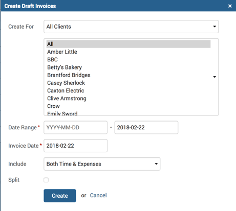 TimeSolv aims to keep its invoicing process as user friendly and as quick as possible. Simply click on the Invoice tab on the main toolbar, and click on Draft Invoices. There you’ll see a button for New Draft Invoices at the top of the screen. A small screen will pop up (below) with uncomplicated fields asking you to specify Client-Matters (you can choose multiple entries on this screen), date range, and the type of service you want to generate for (Time and/or Expense). Once you have made the appropriate selections, hit Create and your draft invoice will be ready for reviewing and sending!