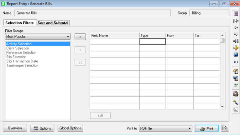 To generate an invoice in Timeslips, you can use either a Generate Bills report or the Billing Assistant. When using Generate Bills box (below), a series of filters and tabs appear for you to specify type of data to be included in the invoice that is about to be generated, such as specific Clients, Date Range, Slip Selection etc. When you are satisfied with your selections, you must print the bill in order to move it onto the Proof Stage, where you have to review and approve bills before you can print them again in their completed state, and where you can also select for them to be emailed out to clients.