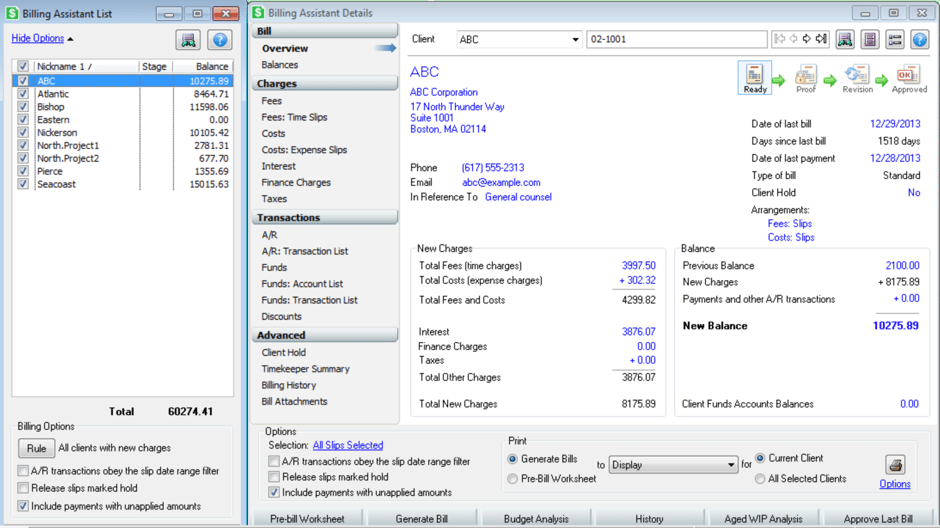 As for Timeslips, there are several different reviewing stages for invoicing. A common first port of call method is the pre-bill worksheet that you print out and have a senior member of staff review by marking corrections on the document before the data is accordingly corrected and the invoice is generated. You can also use their ‘Billing Assistant’ to review the data which has a similar process to TimeSolv in that you click on the dollar amount against each individual client where you can view and edit totals and other details. Thirdly, you can use the Firm Assistant to review billing data for all clients that are ready to bill your entire law firm. As discussed above, each stage will lead to the generating of an invoice through printing a copy out and thereby processing the invoice to a proofing stage:
