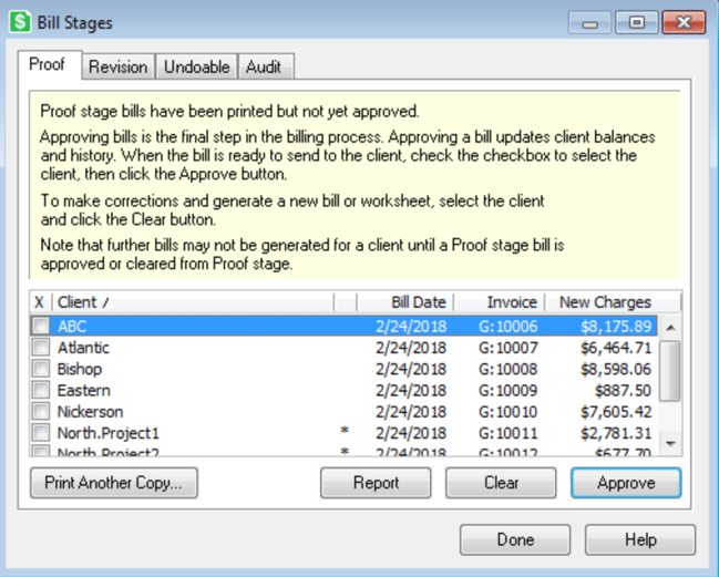 The proof stage holds the invoices until they are reviewed and ready to be sent out. If any edits need to be made, the invoice must be moved into the revision stage before you can make any corrections. Furthermore, if the edit includes adding slips or transactions, you have to clear the bill from the proof stage entirely in order to be allowed to add that missing data, and then start the billing process from scratch. When corrections have been satisfactorily made, you go in and reprint your corrected invoices, and again place them in the proof stage. You continue to repeat this process until the bills are ready to be sent out to clients.