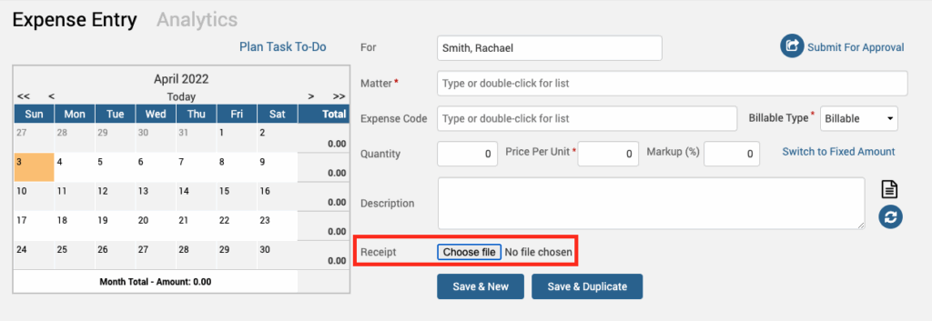 Click on Expense>Expense Entry. Towards the bottom, you’ll see a ‘Choose file’ button next to the Receipt row. There are four file types to choose from, including gif, jpeg, pdf, or png. The maximum allowed file size is 10,000 MBs, which should be plenty to accommodate a receipt.
