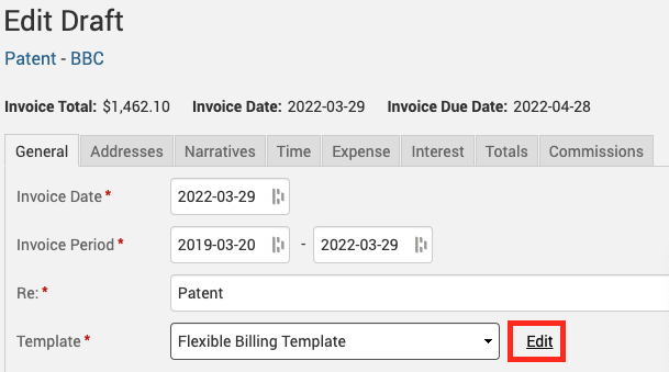 To disable the expense receipts from appearing on invoices, a quick change to the billing template will stop the default attachments. Click on the relevant invoice’s dollar amount under Invoices>Drafts screen. Then click to edit the billing template being used.