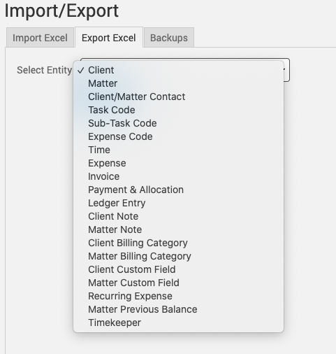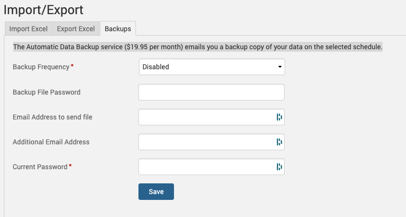 The second option would be to create your own data backups under the Account>Import/Export>Export Excel screen. Here you can select any of the data entities below to save an Excel copy of your data.