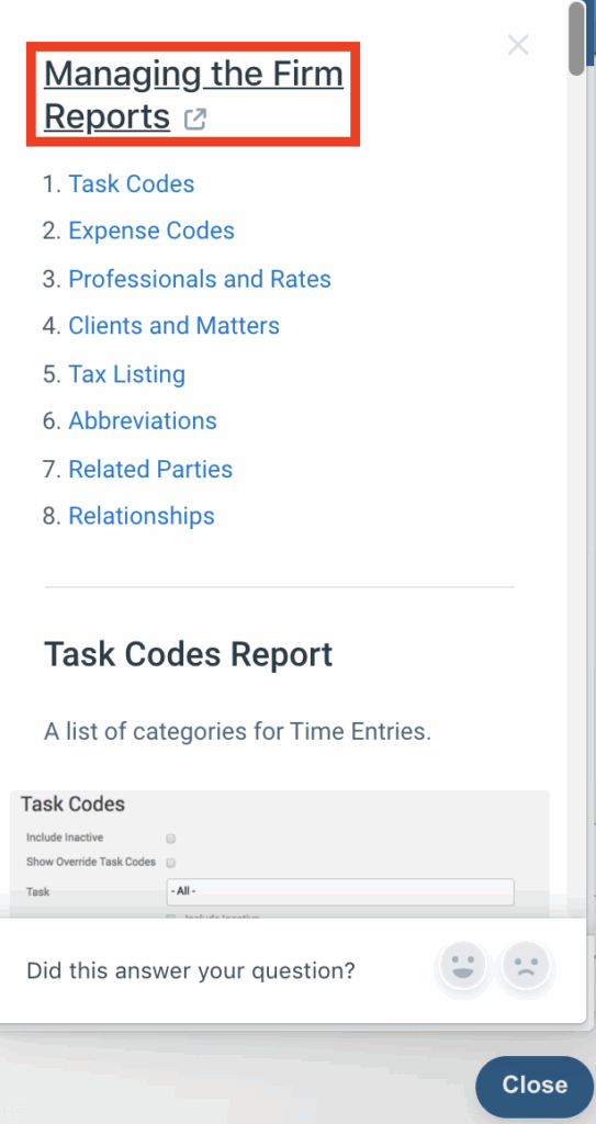 Or, click on the bottom right ‘Help; bubble to see a list of help articles relevant to the screen you’re accessing it from. So from the Time Entry screen, you’ll see a list of Time Entry related articles. If you don’t see what you’re looking for, use the search bar to search for other topics, and view the articles and videos within the app.