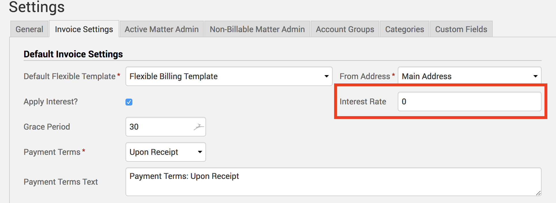 Specify an Interest Rate percentage. Interest Rate is based on an annual percentage rate. As an example, if you were to charge a 5% annual interest, you would enter 5 in this field. Or, if you wanted to charge 1.5% monthly interest, you would type in 18 (because 1.5 * 12 months of the year = 18).