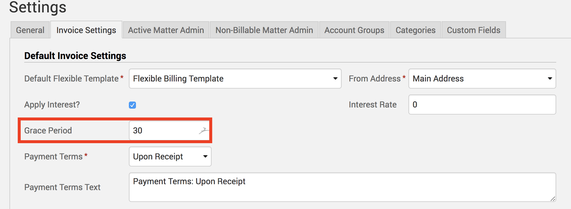 Specify a Grace Period (days). This is the amount of provisional time you will allow the client to make a payment beyond the due date before you begin to charge interest.