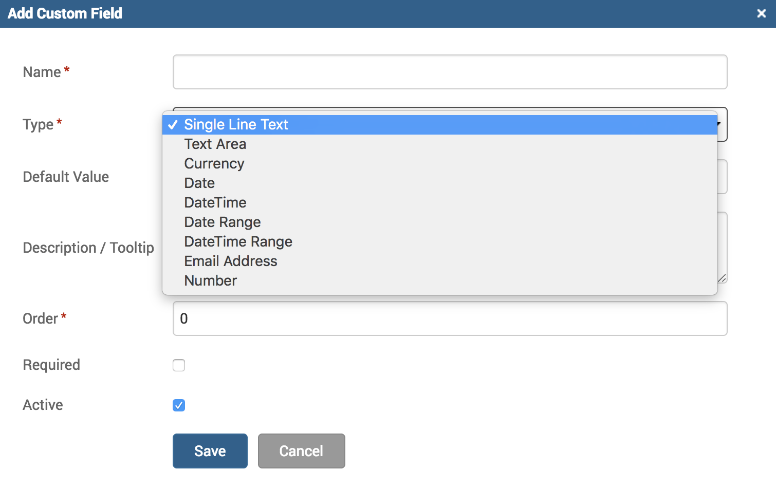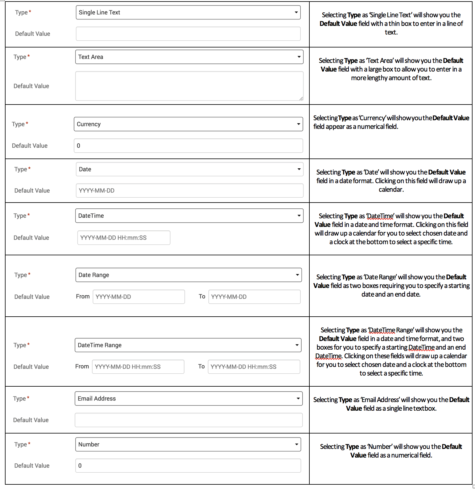 You can see a variety of options available under the ‘Type’ field. Each type will determine how the ‘Default Value’ field will be formatted. Here’s a list of the different ways these choices will impact your custom field to benefit your needs: