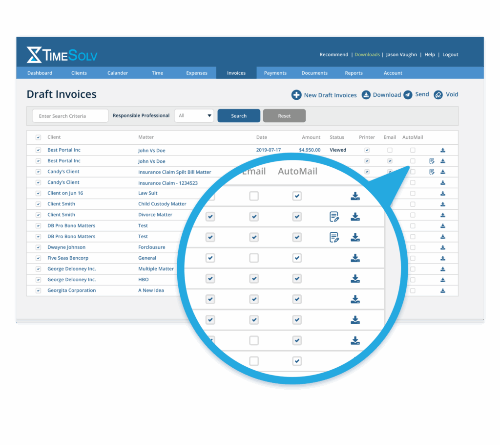 The lesser-known way to send invoices in TimeSolv is for us to do it for you. What does that mean? Well, with the AutoMail feature, we employ a third-party service that does the folding, inserting, stamping, and mailing at $1.49 per invoice. We’ll mail up to five pages for you, saving you the time and effort. You may find that it’s more cost-effective to use our AutoMail service than one of your attorneys or paralegals spending their valuable time with mindless and non-billable work like this.