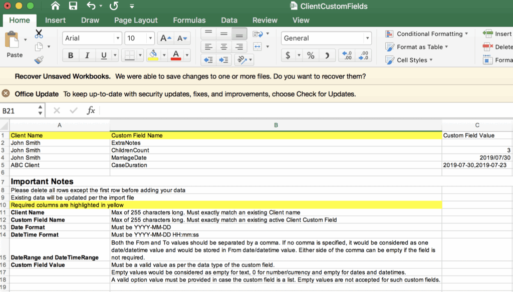 Download the ‘Example File’ which will download an Excel file showing you how the upload file for importing needs to be formatted. As an example, below is the example file for Client Custom Field import.