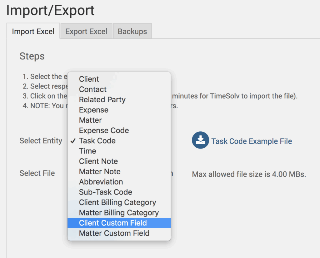 Select the import entity as either Client Custom Fields or Matter Custom Fields.