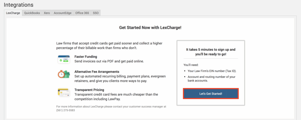 TimeSolv users can apply for their LexCharge merchant account without having to leave the TimeSolv application, providing a truly seamless integration experience. Go to Account>Integrations and start your application from the LexCharge tab.
