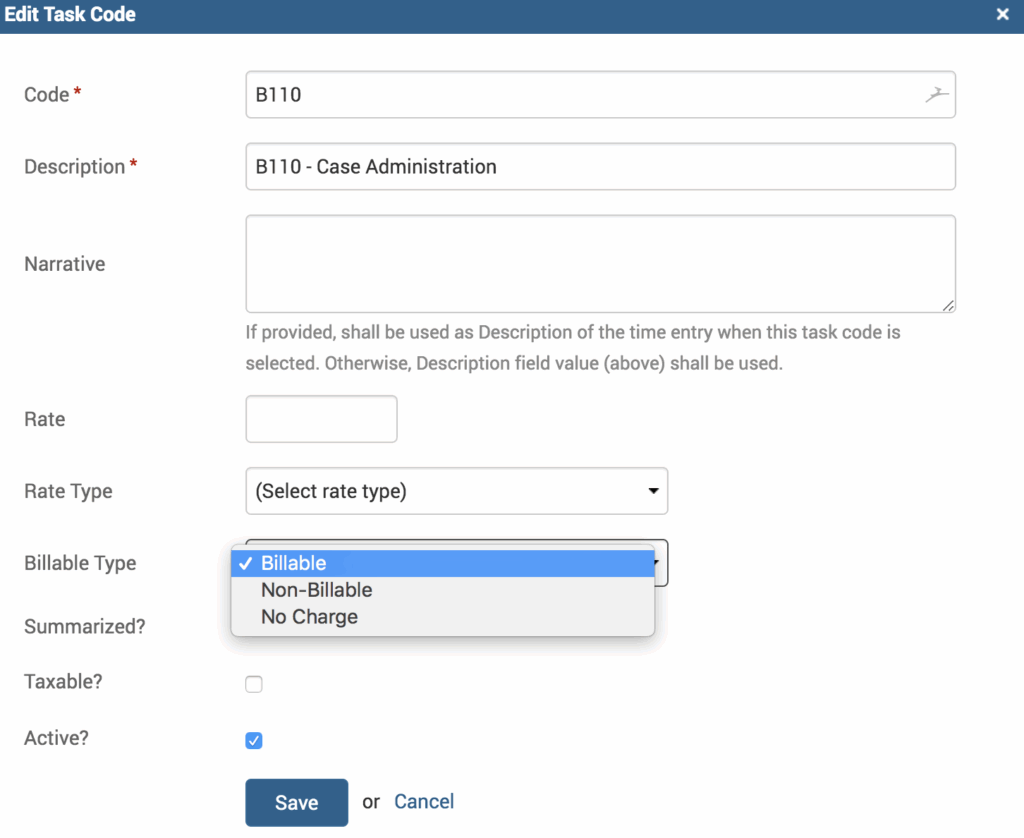 To edit an existing Task/Expense Code, click on the name of the code in the far left column. In the dialog box, you will see a dropdown where you will be able to select the billable type for that particular Task/Expense Code.