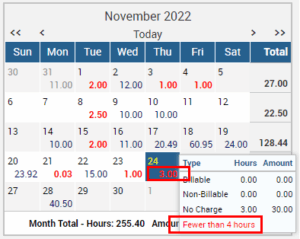 • If ‘Billable Only’ is selected the message ‘Fewer than x billable hours’ appears, warning the Timekeeper that the billable hours have fallen short of minimum daily hours .