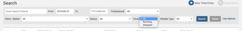 Searching for ‘Timer – All’ will pull all the Time Entries with running and not running timers. Searching for ‘Timer – Running’ will filter the Time Entries which have running timers, and searching for ‘Timer – Stopped’ will filter the Time Entries which have no running timers.