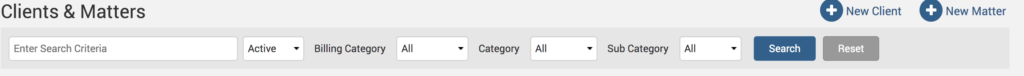 Head over to Clients>Clients & Matters. There’s a search bar towards the top of the screen, and you’ll see the new search fields for Billing Category, Category, and Sub-Category.