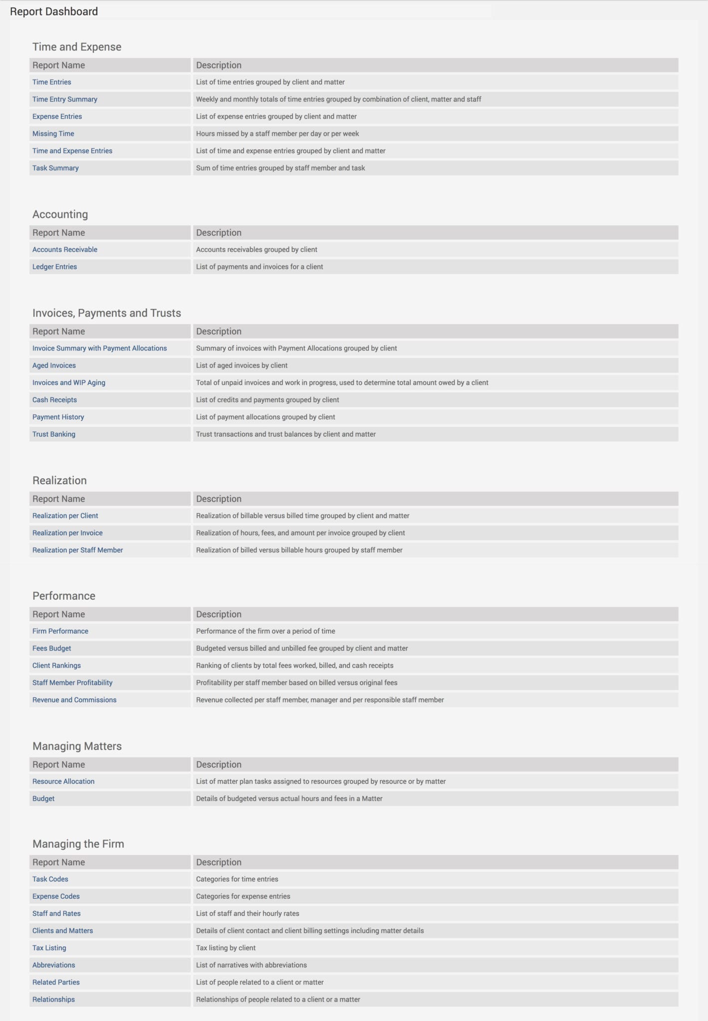 Monthly and annual reports are valuable tools in building a successful law practice. They provide you with detailed information about your firm from a variety of financial and management perspectives. Used properly, monthly reports can help you identify what is working within your business and what needs improvement. Gain fresh insights into your business with 31 different reports for law firms and other businesses covering billable hours, accounts receivable, expenses, performance, and more. Our insightful reports can be viewed and shared in 10 formats, including PDF, Excel, Word, and more.