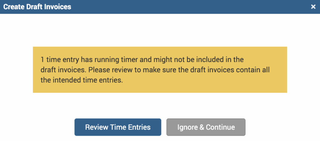Now, if you have a timer(s) running in the background and try to generate an invoice against that Matter(s), you’ll see the following message: