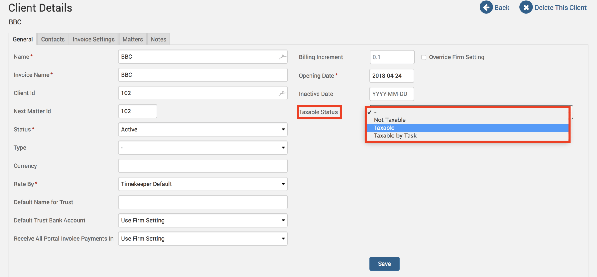 Users can head under individual client details to specify whether the client is simply Taxable or Taxable by Task. To do this, go under Clients>Clients & Matters>[client name]>Taxable Status.