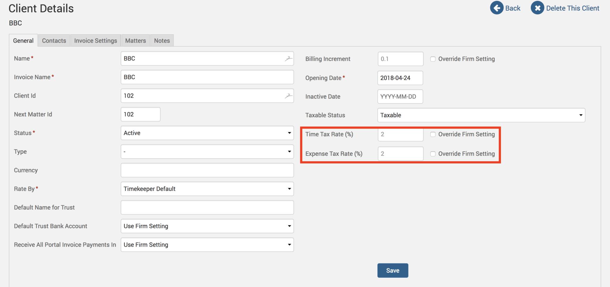 When users select either Taxable or Taxable by Task from the drop-down list of options, two fields will appear below allowing you to specify the Time and Expense tax rate percentage. If these percentages are already set up under Time>Settings or under Expense>Settings, you may select the ‘Override Firm Setting’ checkbox to customize the tax rate for this client as a different amount from the firm-wide settings.