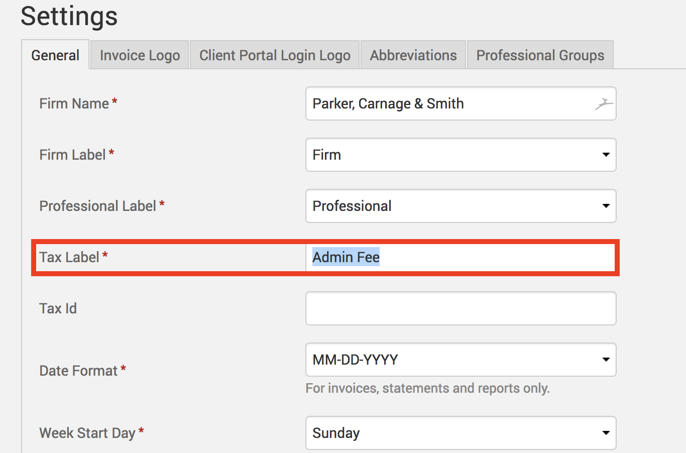 Alternatively, users can customize the tax label field to whatever is needed for their business needs, such as an admin fee. Click on Account>Settings>Tax Label. Specify the custom label you wish to rename it to (example below).