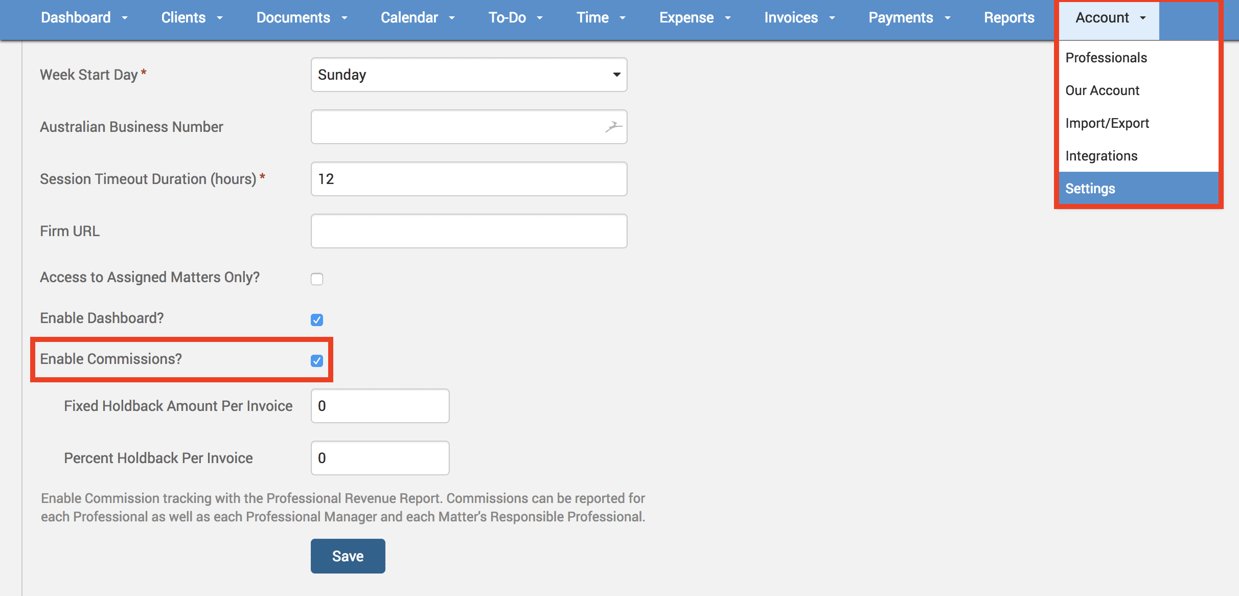 Firstly, an Administrator user that has access to firm-wide settings needs to head under Account>Settings. Under the General tab, there’s a field ‘Enable Commissions‘. Check that field.