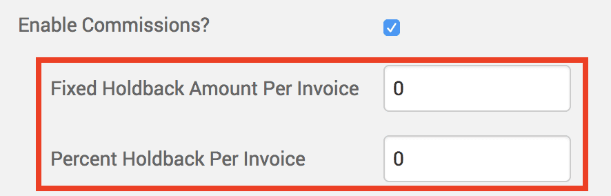 This will then enable the user to edit the two fields that appear below the ‘Enable Commissions’ checkbox. In these fields specify Fixed Holdback Amount Per Invoice and Percent Holdback Per Invoice. Specifying amounts in these fields will generate firm-wide commissions on all invoices generated.