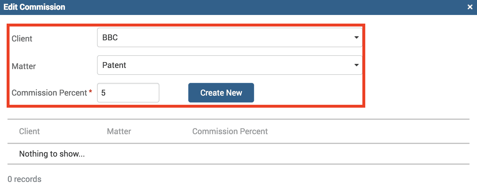 Once the user has specified the Client and Matter and Commission Percent, hit the Create New button.