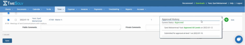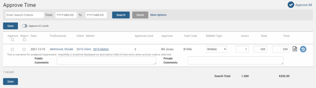 In addition to this, we have an ‘Approval All Levels’ checkbox at the top of the list (next to the top ‘Save’ button). Firm Admin users can focus on getting an entry approved quicker by using this checkbox to bypass any other pending approval stages.