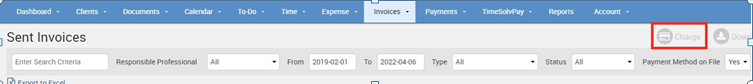 Once you have those payment details stored, the firm can navigate to Invoices>Sent screen and charge that credit card whenever needed. For example, if you select an invoice via the checkbox, and select the ‘Charge’ button on the top right side of the screen, the system will run a payment against the card on file.