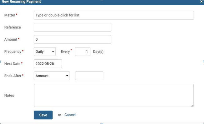 The firm can even set up recurring payments against a card/bank account by clicking under TimeSolvPay>Recurring Payments screen. These can be set up as daily, weekly, monthly, or annually. You can event set up the end time, which can be either by the amount collected, after X amount of charges, or after a certain date.