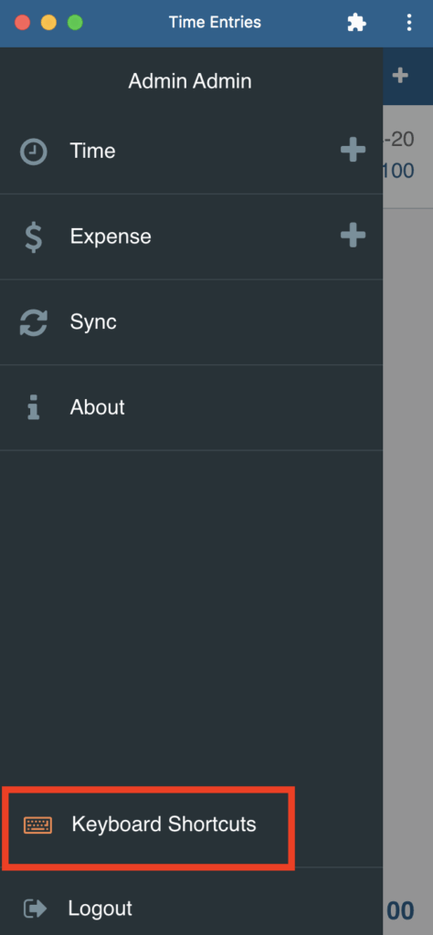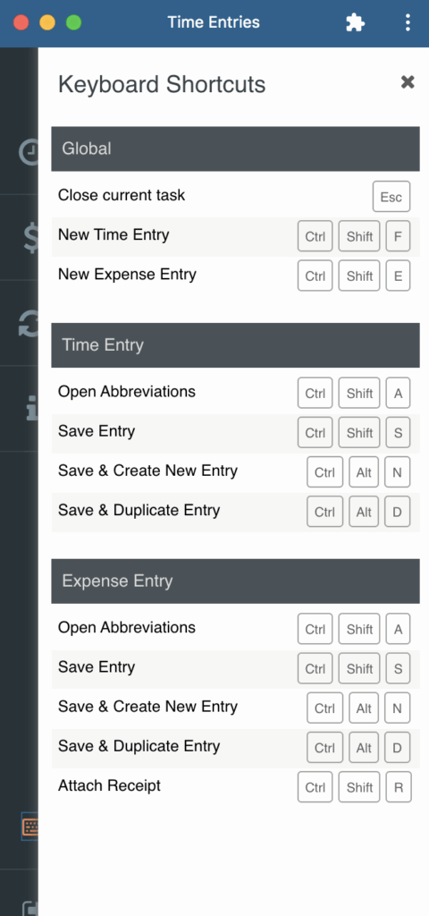 Keyboard shortcuts in the TimeSync app are available to help our users create Time and Expense entries quicker. When you first log in to the TimeSync app, click on the three bars on the top left of the screen. Here you’ll see an option appear at the bottom of the screen to view keyboard shortcuts: