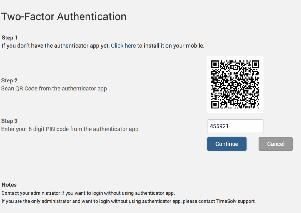 Once successfully scanned, you’ll get a unique 6 digit PIN code from the authenticator app that’s only valid for a few seconds, so make sure you’re quick to type that into the field shown on ‘Step 3‘ of the TimeSolv screen. You should be logged in now and ready to go.