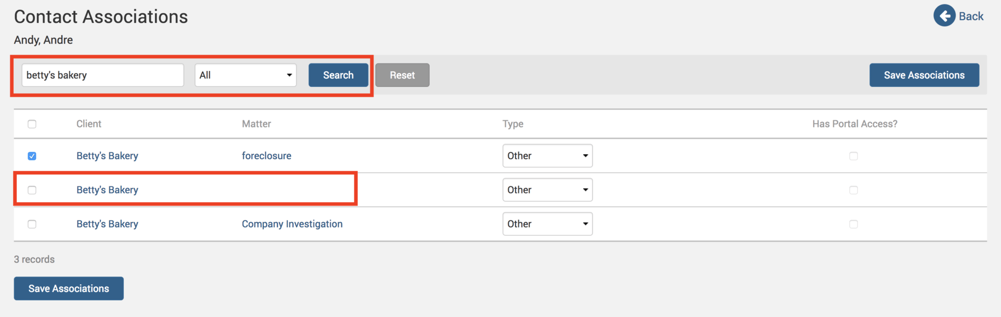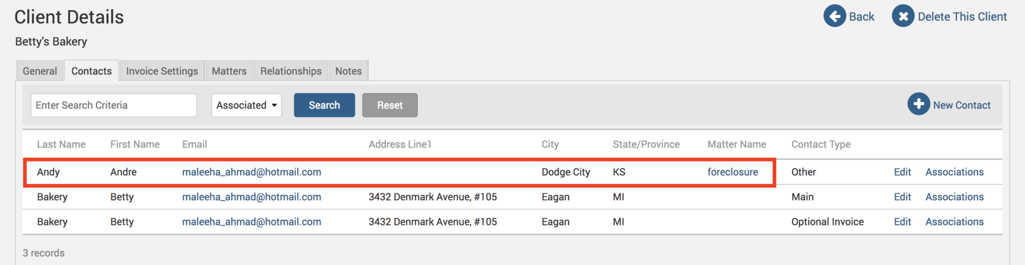 Find the Client level contact for that Matter. Again, you can recognize it as a Client level contact if there is no Matter name listed under the Matter column: