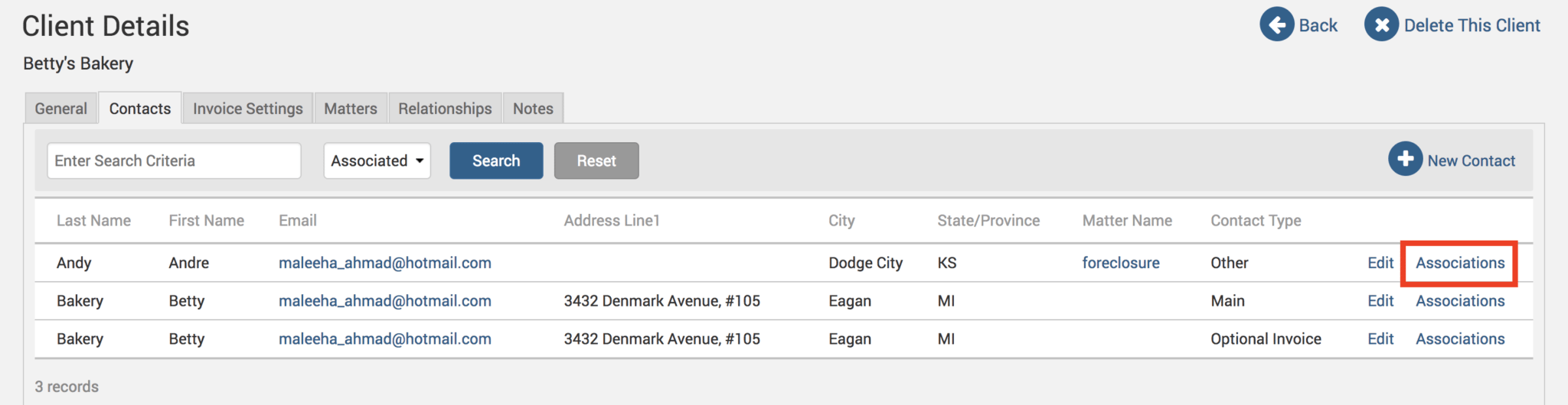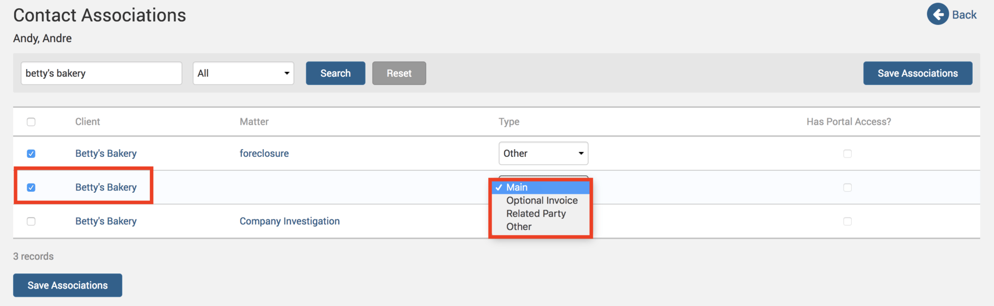 Select that contact, and make sure you select ‘Main’ or ‘Optional Invoice’ as the contact type. Click on Save Associations button and you will now have those Matter level contact details listed under the Client details through the new association.