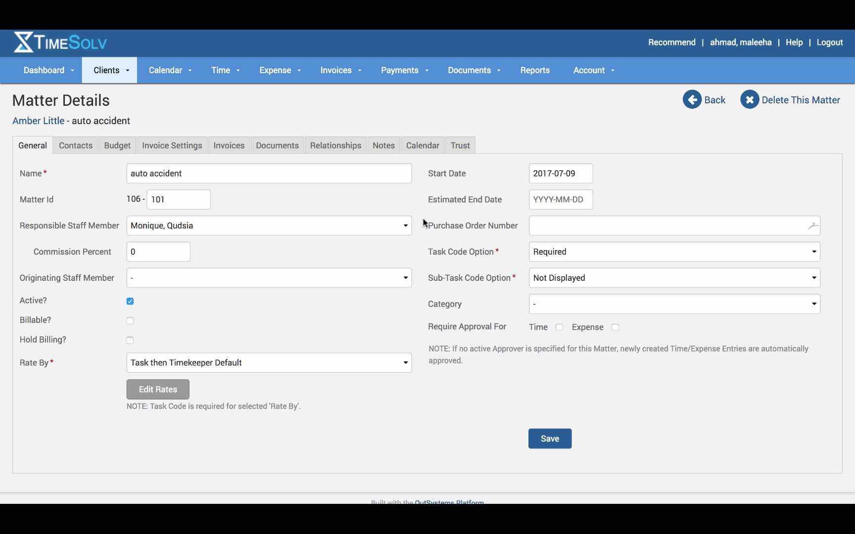 Return to the time entry page and specify the same Client/Matter you just setup for the custom task rates (above), and specify the task code you have just set up the custom rate for (above). You will notice that after these selections, the Rate box has been auto-populated with your custom task code rate.