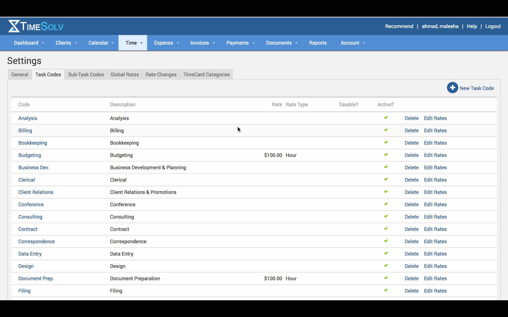 Task Codes (also known as Activity Codes) are predefined work descriptions that are associated with time entries and may optionally specify a rate for the work being described. A Task Code, by default, has no rate associated with it. However, TimeSolv does support hourly and task based Task Code rates with the goal of providing the flexibility of additional rates.