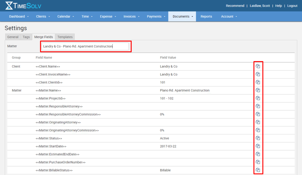 Firstly, click on Documents>Settings>Merge Fields tab. A list of available merge fields will appear. The Group column lists the type of merge field group, i.e. Client, Matter, User, and Date. The Field Name column lists the text you will copy and paste into your document. The Field Value column will show you the data information as it will be displayed for this relevant client-matter. When you click on the documents icon in the last column, it will copy the Field Name text onto your clipboard, ready for pasting into your document.