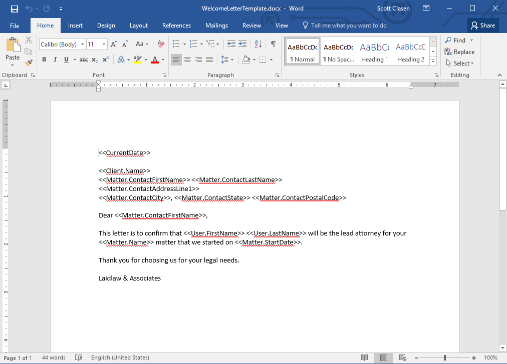 To do this, open a document in Microsoft Word and write up the draft for your frequented letter. Copy and paste the Field Name text wherever you need to insert client-matter data. You’ll end up with a document similar to our sample Welcome Letter below.