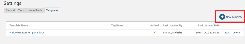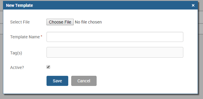 Select Choose File and navigate to your saved template document. Assign a Name and any necessary Tags. Select the Active checkbox to ensure the new template is operative, then click Save to complete the upload process.
