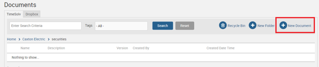 Once the document template is uploaded, navigate to Documents>Documents and select the client-matter-folder where you wish to store this new document. When you click on the New Document link, you can choose Create From Template as the source.