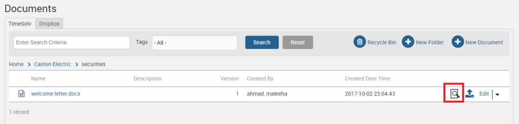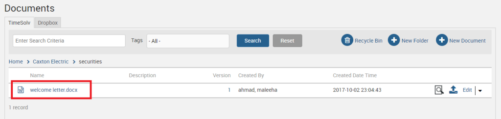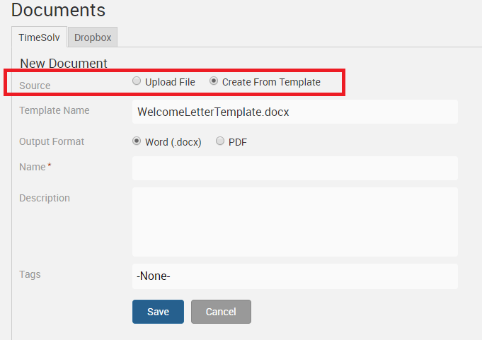 A list of templates you have uploaded will appear. Select the relevant template and specify whether you wish to create the template as Word or PDF. Assign a name to the document, and add a description. You can also add additional tags to the ones you created for this template earlier. Click on Save.