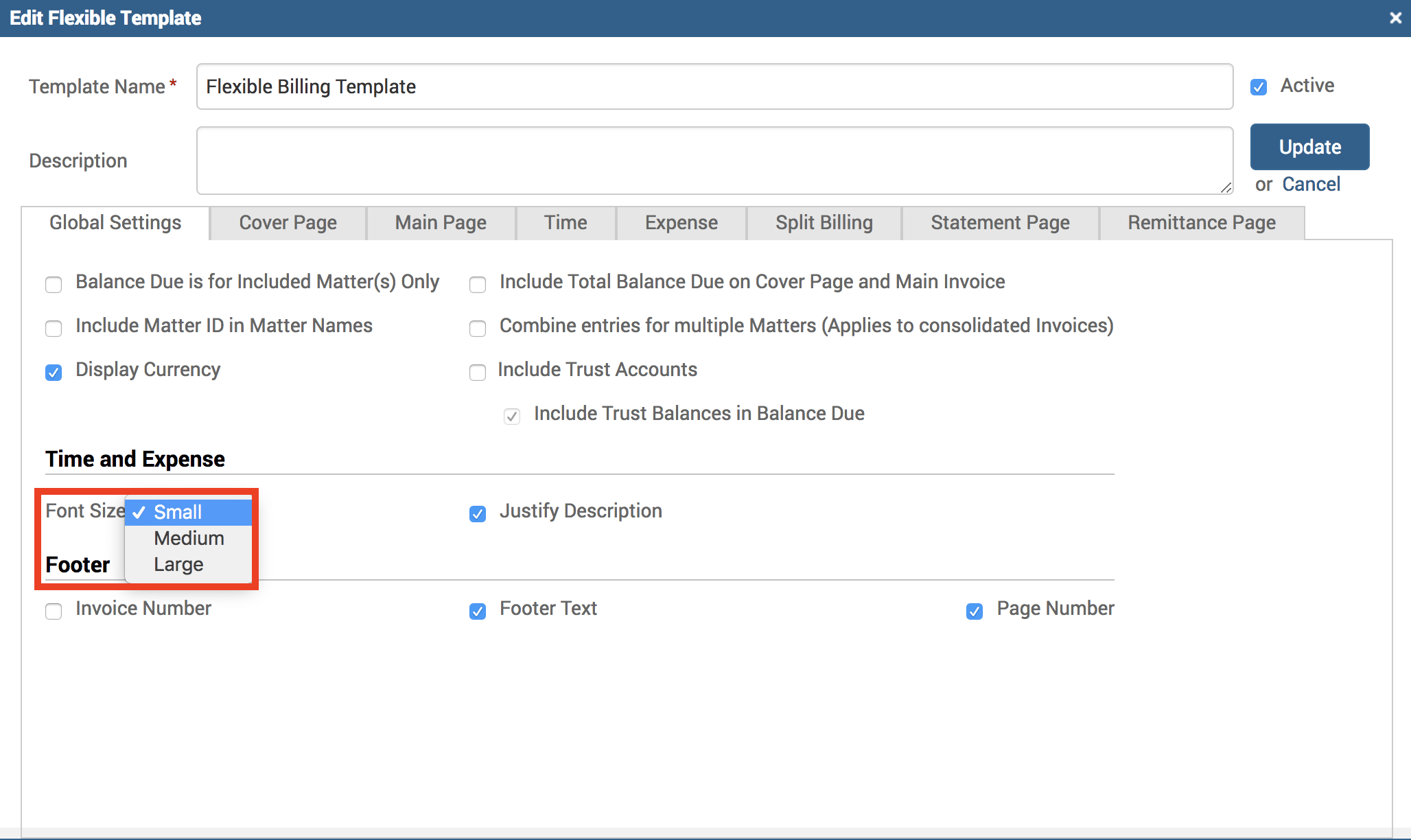 - Under Global Settings tab, specify Font Size as either Small (9 pt), Medium (10 pt), or Large (11 pt) on your invoices. By default this will be set to small font.