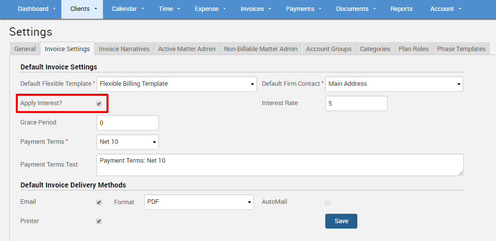 – Set Payment Terms from either Upon Receipt or a Net amount. Interest will not start accruing until the grace period plus specified payment terms days have run their course.