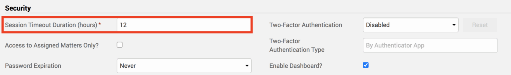 As a firm Admin, click on Account>Settings. Towards the bottom of the General tab, you will see a ‘Security‘ section. The first field under it is ‘Session Timeout Duration (hours)‘; this is the length of time a user can remain logged on to the TimeSolv web app while there is no activity taking place. TimeSolv automatically ends a Tiimekeeper’s session once the defined amount of time has elapsed. For example, if you would like inactive users to be automatically logged out after 30 minutes, enter 0.5.