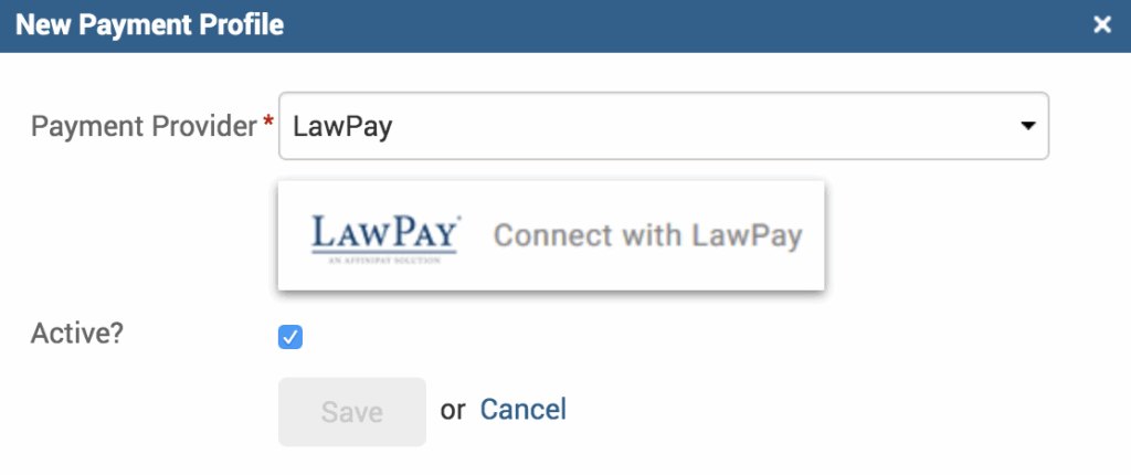 Connect to your LawPay account by clicking on the Connect with LawPay link in the ‘Create Payment Profile’ pop-up. This will open up a new tab and require you to log in to your LawPay account. Once logged in, you will be automatically redirected to the TimeSolv web app and connected.