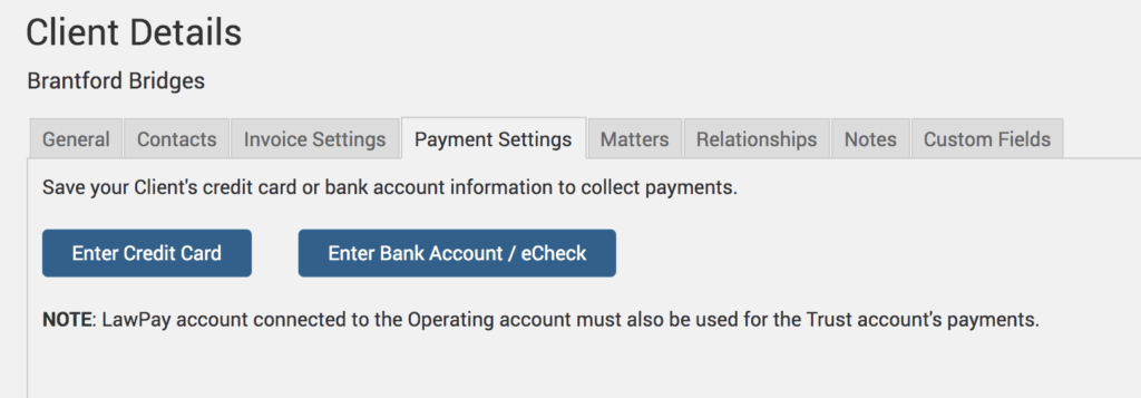 Next, head under Clients>Clients & Matters>[Client or Matter name]>Payment Settings tab to store the credit card, bank account, or eCheck details. Matters will automatically inherit the Client-level payment settings, but you can have additional/different credit card/bank account details stored under individual Matters.