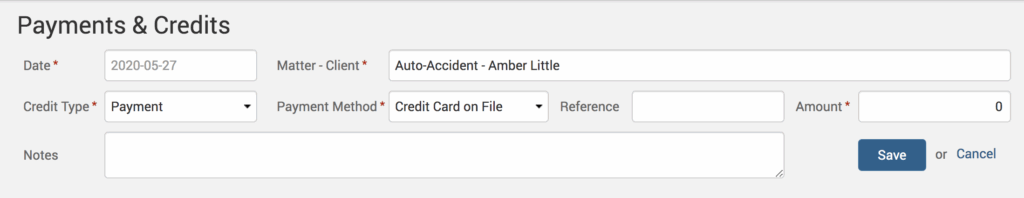 Enter in an ‘Amount‘ and hit Save – this will charge the Client’s card/account via LawPay. They will be emailed a receipt via LawPay to the email address on file.