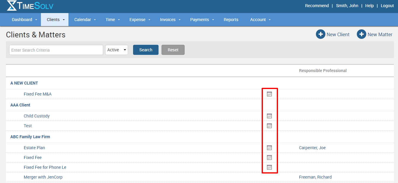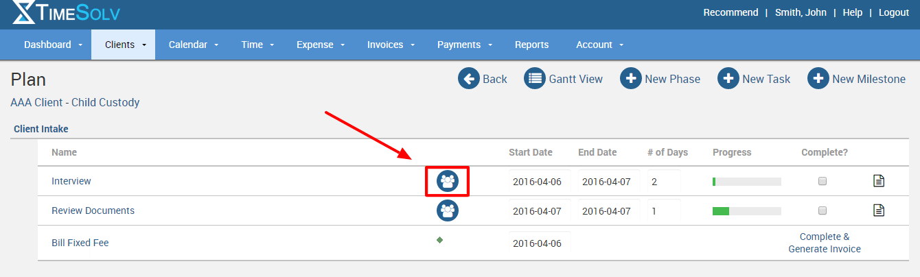 Once you’ve created a matter plan, you’ll want to revisit the phases, tasks and milestones frequently. All you have to do is click on the calendar icon when viewing your matters and clients.