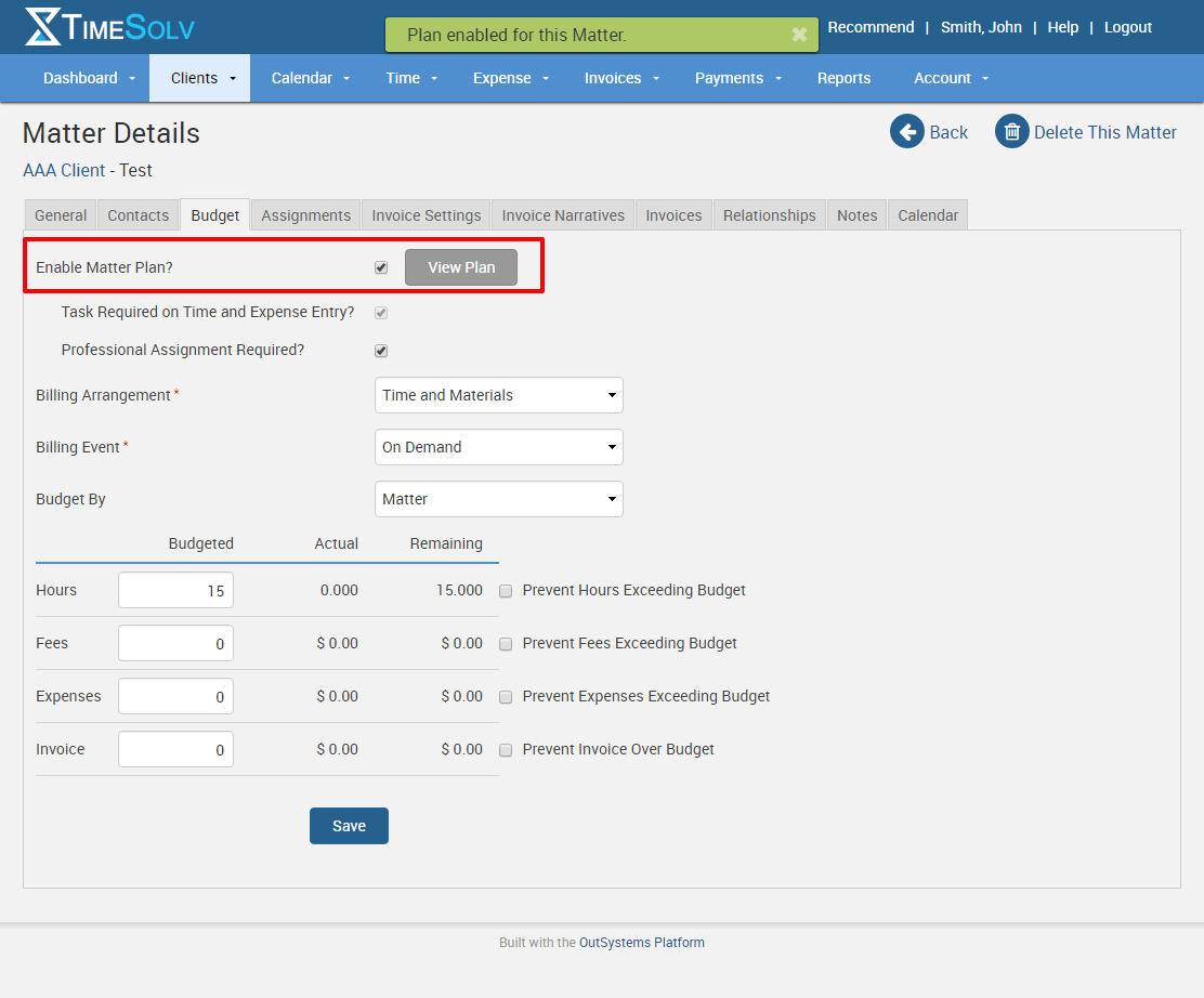 The first step on the road to creating your project is to first create a new matter. Under our Clients tab, go to Clients & Matters and click on New Matter in the upper right corner. Once you’ve named your matter and chosen the client, you’ll want to click on the Budget tab and then check the box where it says “Enable Matter Plan?” and save. Then you can click on the “View Plan” button to start building the project.